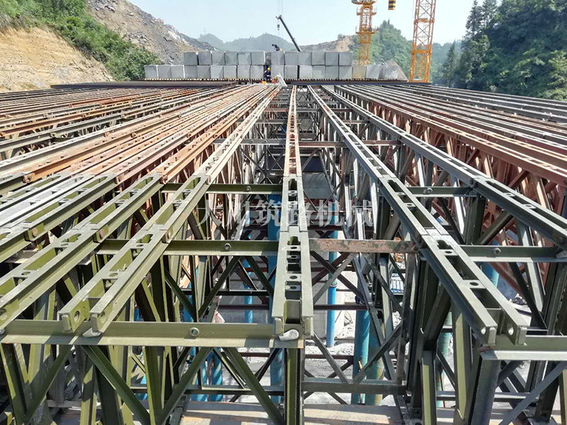特點:現(xiàn)澆梁支架平臺的跨度大,高度高,施工現(xiàn)場場所地非常有限,在局促的場地中和其他施工隊伍的場地需交叉作業(yè)。安裝過程中因拼好的主梁沒有平整的場地放置,需要在拼好的貝雷片上面拼裝對接;有些梁也因場地原因致使吊機沒有好的停車位,不能整根梁吊裝,采用半根梁吊裝在空中對接方式完成安裝,施工難度較大。